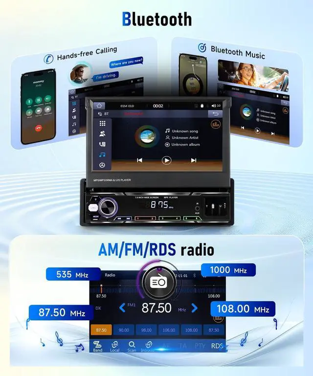 Via carplay or android auto, you can use GPS, music playback, send messages, and more functions ^^ 5.1B luetooth & AM/RDS/FM & EQ Bluetooth 5.1 enables fast pairing for music and contact syncing. This bluetooth car stereo supports music playback, hands-free calls, and phonebook access. AM/RDS/FM Radios allows you to listen to radio stations, providing various music, news, etc.