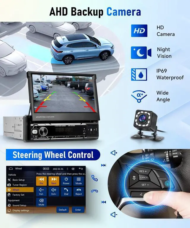 EQ deliver various music effects: Vbass, Balance, Emperor, Filter, Loudness, etc ^^ 7Color key light & Outer Interface This bluetooth car stereo head unit has 2 front-facing USB ports for quick phone charging and file input, as well as an AUX port, mobile phones, music players, etc. Enhanced with a 7-color button light, it ensures visibility even in the darkest settings ^^ RCA Output& Mirror Link The wireless carplay car stereo connect with RCA, support car headrest video output, your family or friends could enjoy videos in the backseat. The 7-inch 1080P HD touch screen enables you to enjoy various mobile apps and use the mirror link function to watch videos ^^ Steering Wheel Controls & 12LED Backup Camera This 1 din touch screen car stereo supports SWC, including song/channel switching, volume adjustment, call answering, etc. The car stereo with a backup camera features HD 170-degree and IP69, waterproof and dustproof, providing a clear view whether at night, in rainy, foggy, or dusty weather