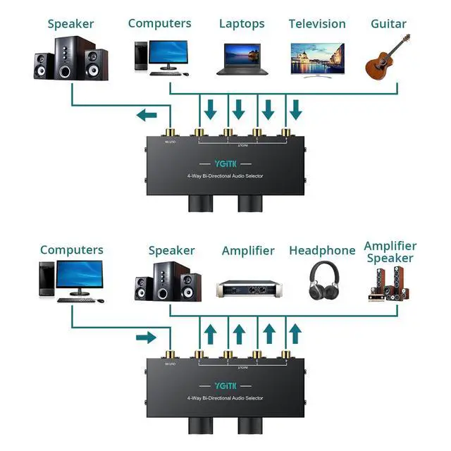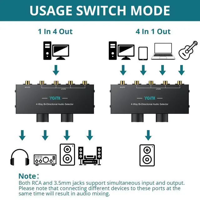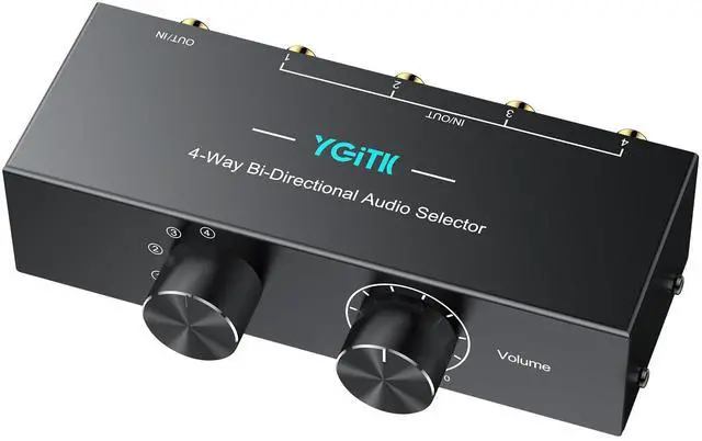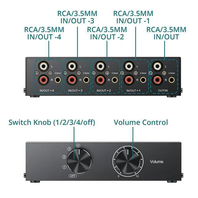 Flexible Bidirectional Stereo Audio SwitcherEasily switch 1 audio source to 4 output devices (like PC to speakers/headphones) or choose between 4 audio inputs (like CD player & turntable) and get 1 output. Eliminates cable swapping, saving time and reducing wear on ports. Perfect for DIY enthusiasts and audiophiles managing multiple devices! ^^ Dual AUX & RCA Ports, Universal CompatibilityOur 3.5 mm splitter is equipped with 3.5 mm AUX and L/R RCA interfaces to seamlessly connect PCs, smartphones, turntables, and amplifiers. Its plug-and-play design guarantees instant compatibility and a hassle-free setup for all your audio gear, eliminating the need for any extra adapters ^^ Simultaneous Dual Output, Share Audio effortlesslyThe selected channel outputs audio via both AUX and RCA ports at once, allowing you to connect headphones and powered speakers simultaneously.