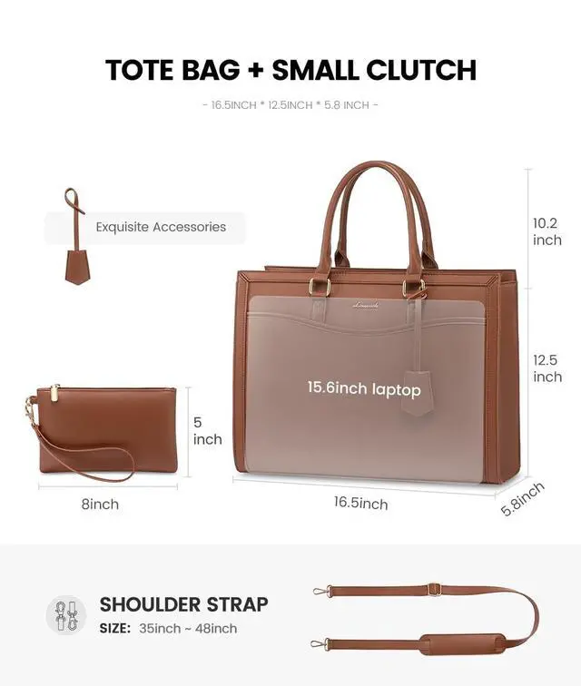 • Perfect Size Work BagThe dimension of the work bag for women is 16.5" x 5.9" x 12.5"(L*W*H). Handle drop: 6.3''. Small Clutch:8" x 5" Net weight: 2.31 lbs. Adjustable shoulder strap is 27~48 inches. Suitable for most 13"/14"/15"/15.6" laptops, and it is large enough to make your daily stuff well organized.