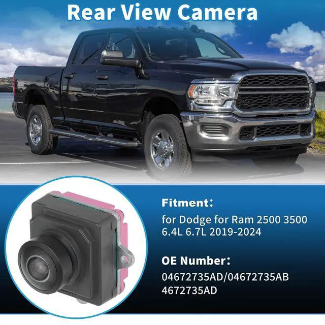 [Vehicle Fitment] This rear view camera is for Dodge for Ram 2500 3500 6.4L 6.7L 2019-2024. Specific fit license plate camera replaces No. 04672735AD/04672735AB/4672735AD. ^^ [Crystal-Clear Visibility] Ultra-clear image quality. There're anti-fog HD glass and color CMOS image sensors inside this backup camera reverse camera so as to provide satisfactory color reproduction and a clear view for car owners. ^^ [Night Vision] With 170 degree wide view detection angle and 1920x1080 camera resolution, it performs normally also as night vision camera, even in the faint light like a dark underground garage. ^^ [Waterproof] This parking assist camera has a waterproof rating at IP68 for all conditions like heavy rain or car washes.