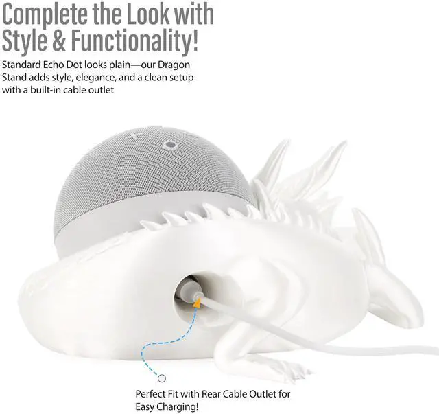 Introducing the Costume Wizard Dragon Stand, a meticulously crafted 3D printed dragon designed to elegantly hold your Echo Dot 4th/5th Gen smart speaker. Made in the USA, our dragon stands are not just about aesthetics; they support American workers by utilizing high-quality materials and expert craftsmanship. Whether you are a dragon enthusiast or looking to add a touch of mythical charm to your home or office, this desktop speaker stand is the perfect choice. Our dragon stand transforms your echo devices into a centerpiece, adding an enchanting element to your decor.
