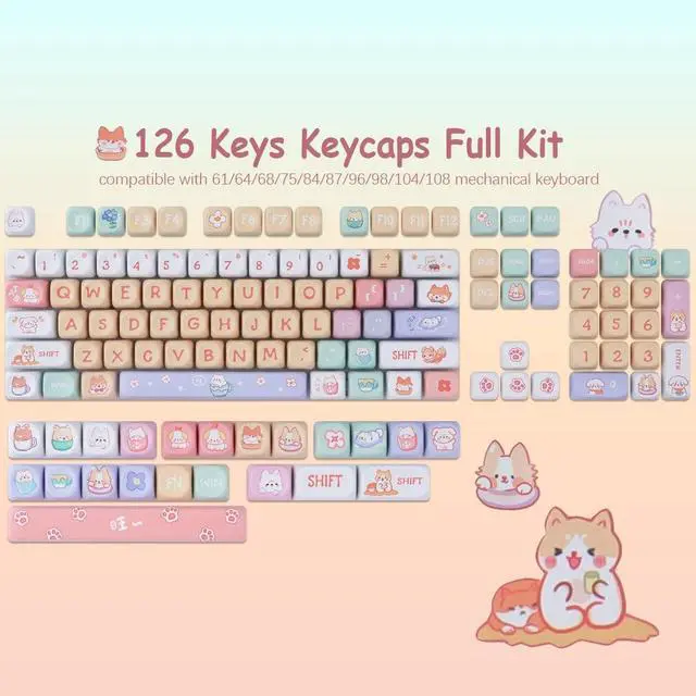 Keycaps Set: This keycap set contains 126 PBT keys, fit most 60%/65%/75%/80%/96%/100% (61/64/68/75/84/87/96/980/104/108) US layout mechanical keyboard ^^