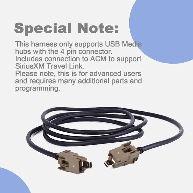 Special Note: This harness only supports USB Media hubs with the 4 pin connector. Includes connection to ACM to support SiriusXM Travel Link. Please note, this is for advanced users and requires many additional parts and programming ^^
