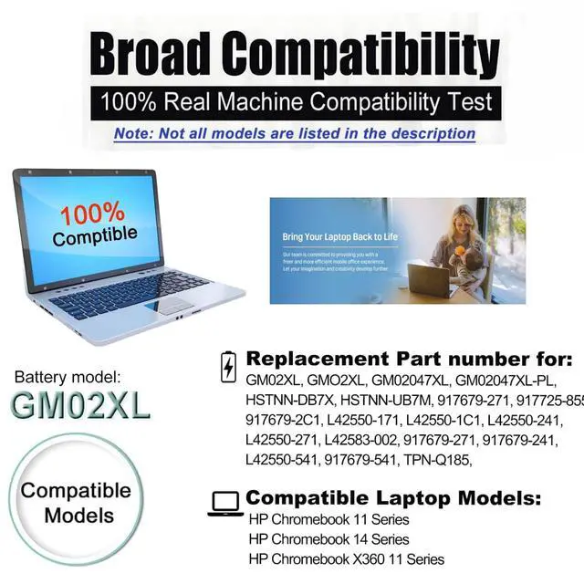 FCC RoHSColor: BlackCompatible Part NumbersTo ensure compatibility, please cross check if the part number (located at the back of your original battery) is listed in the Fits Parts Number list. Ctrl + F to search the modelGM02XL 917679-2C1 917725-855 917725855 917679-271 917679-541 917679-241 917679241 HSTNN-DB7X HSTNNDB7X HSTNN-UB7M HSTNNUB7M L42550-171 L42550171 L42550-1C1 L425501C1 L42550-241 L42550241L42550-271 L42550271 L42583-002 L42583002 L42550-541 L42550541 L42550-2C1 L425502C1 GM02047XL GM02047XL-PL GM02047XLPL TPN-Q185 TPNQ185 TPN-Q203 TPN-Q204HP Chromebook X360 11-AE Series, HP Chromebook 14 G5 Series, HP Chromebook X360 11 G1 Series, HP Chromebook 11 G3 EE (Education Edition) HP Chromebook 14 G5 14-CA Series, HP Chromebook X360 11 G1 G6 Series, HP Chromebook 11 G6 EE (Education Edition) Series, HP Chromebook 11 G7 EE Series HP Chromebook 11A G6 EE Series, HP Chromebook X360 11 G1 EE Series, HP Chromebook 11A-NB0013DX 11A-NB0047NRBuy with Confidence! 100% New from Pro-ManufacturerHigh QualityMore Professiona12-Month Warranty24 x 7 Email Support