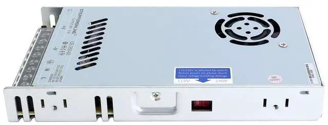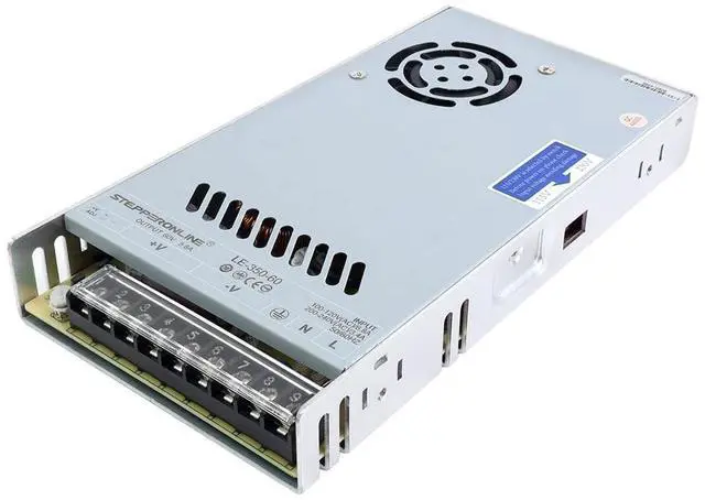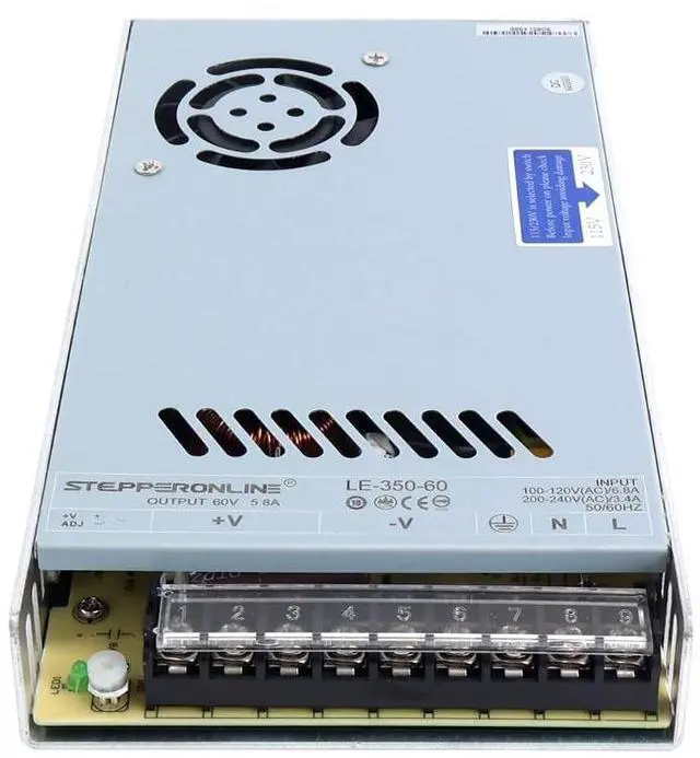 This LE series switching power supply has an output power of 350W, an output voltage of 60V, and an output current of 5.8A. Selectable input voltage of 115V and 230V is available via a switch. Optimized for industrial automation applications, this power supply features an ultra-thin size, ultra-large output capacitor, high efficiency, low temperature rise, and other beneficial characteristics. It is an excellent choice for applications demanding stable performance, high reliability, and high durability, such as 3D printers, computers, industrial automation systems, and CNC stepper/servo systems.