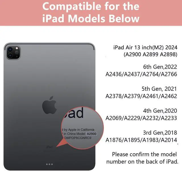 Design for Various iPad Models: This keyboard case not only compatible for the iPad Air 13 inch(M2) 2024 (A2900 A2899 A2898), but also suitable for iPad 2022 12.9 inch Pro 6th Gen (A2436/A2437/2764/A2766), 2021 12.9 inch Pro 5th Generation (A2378, A2379, A2461, A2462); 2020 12.9 inch Pro 4th Generation (A2229, A2069, A2232, A2233); 2018 12.9 inch Pro 3rd Generation (A1876, A2014, A1895, A1983). Please kindly check your tablet model before purchasing.