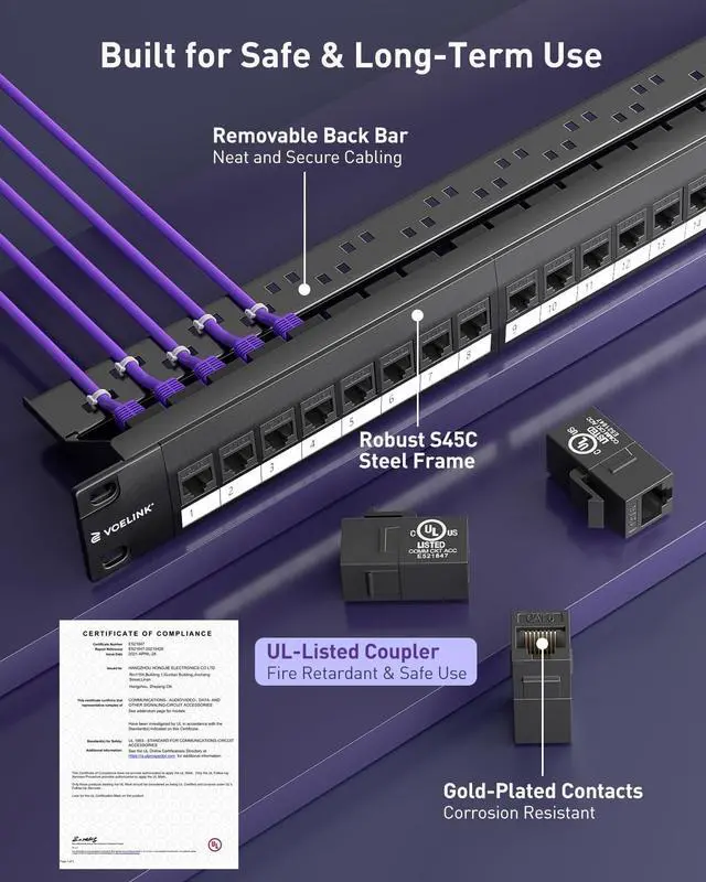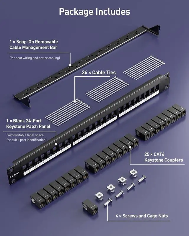 VCELINK 24 Port Keystone Patch Panel 1U 19-Inch, with 25-Pack UL-Listed UTP CAT6 Keystone Coupler and Removable Cable Management Bar, 10G Support (25 x Cat6 Coupler (Black))