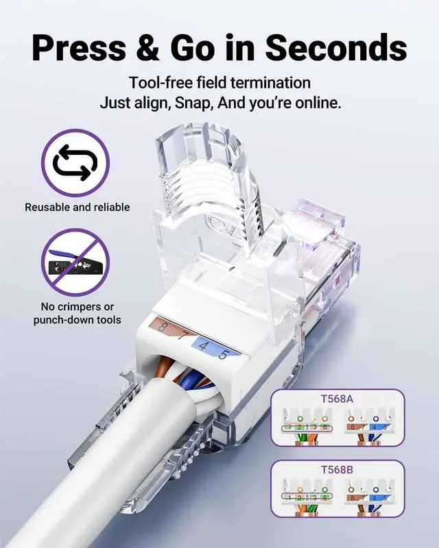 & REUSABLE TERMINATION: No crimping or punch-down tools. Just align your wires, snap shut the housing, and you're online. Ideal for on-site work and emergency repairs. Fully resuable for multiple installationscost-effective for pros and DIYers alike ^^ 10