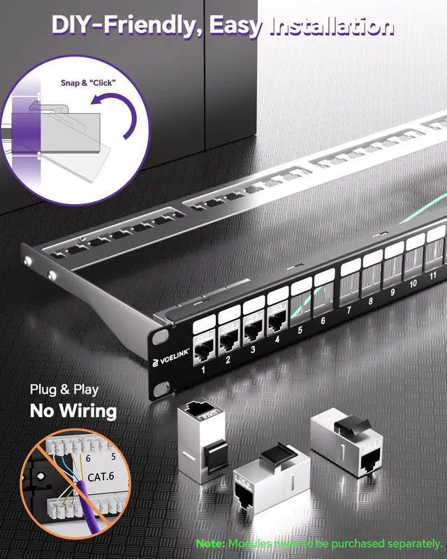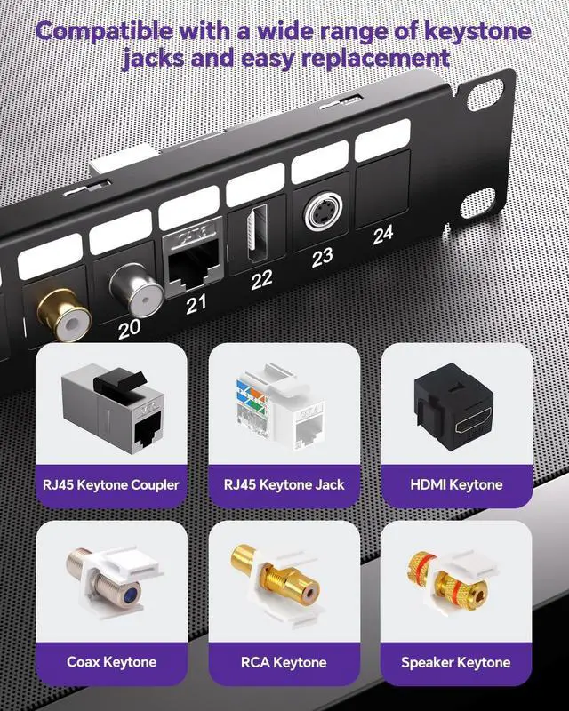 ^^ VERSATILE: Works with Cat6A, Cat6, or Cat5e shielded/unshielded keystone jacks, couplers, and Ethernet cables. The 1U keystone patch panel is compatible with various keystone jacks, including RJ45, RCA, HDMI, fiber, speaker, and coax.