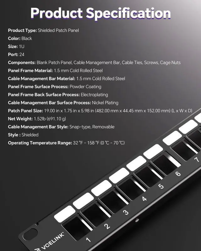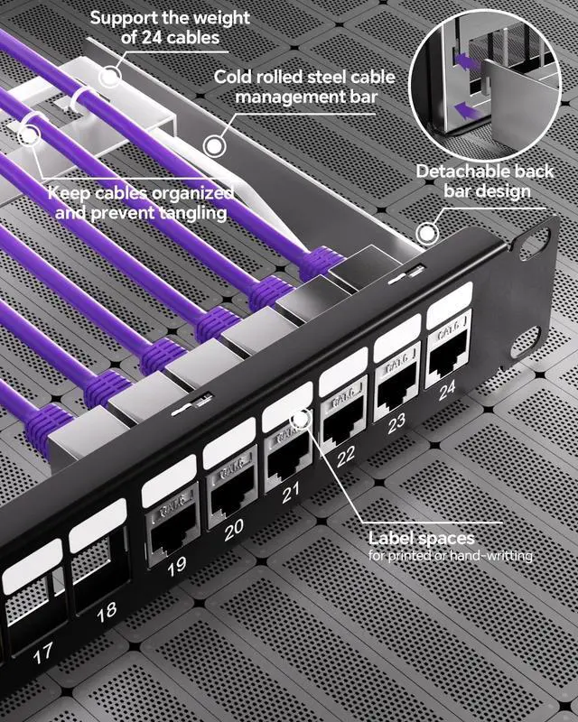 ^^ STURDY & DURABLE: The patch panel, made of all-metal material, is crafted from 1.5 mm cold-rolled steel for long-term use, it delivers corrosion resistance while protecting crushing forces crushing forces. Unit measures 19" W x 1.75" H. Minimum 8" rack depth recommended for clearance.