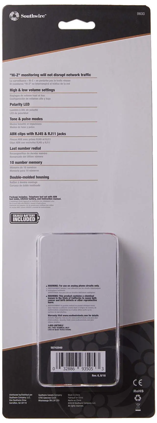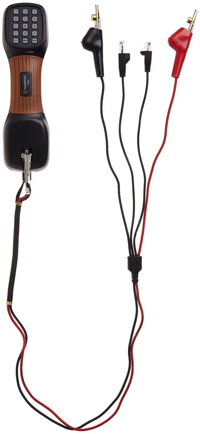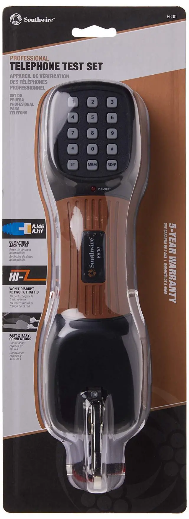 Southwire B600 professional telephone test set "hi-z" monitoring will not disrupt network traffic. High and low volume settings, polarity LED, tone & pulse modes. Abn (Angled bed of nails) clips with rugged RJ45 and RJ11 plugs