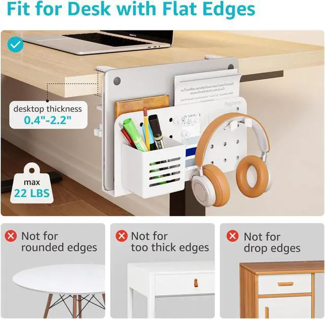 SPACE-SAVING UNDER-DESK STORAGE: Designed to fit most flat edge desks, it can be conveniently installed on the side of the desk to maximize desktop space. Available in two colors: black and white.