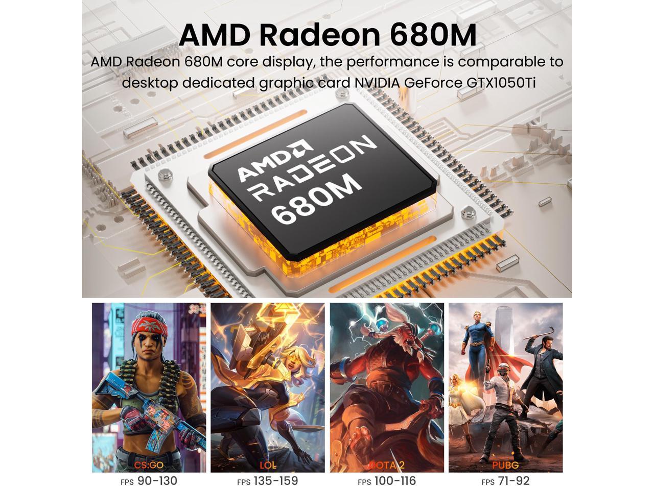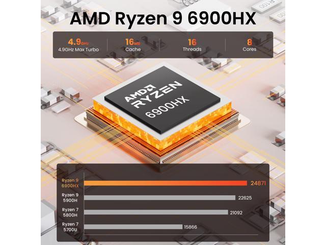 - [(AMD Ryzen 9 6900HX)] The Beelink EQR6 Mini PC is equipped with AMD Ryzen 9 6900HX (8 cores/16 threads, up to 4.3 GHz). This mini computers performance is improved by 36% compared with 5700U, 25% by 5800U, and 10% by 5900HX. It enables seamless gaming experiences for popular games like LoL, CS:GO, DOTA2, and PUBG. Additionally, the mini pc enables smoothly edit high-resolution videos and images. Enhance your work efficiency and entertainment convenience with this powerful device