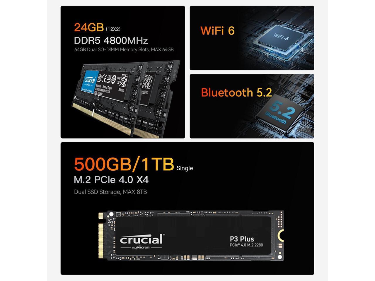 - [(24 GB DDR5 & 1 TB PCIe4.0 SSD)] The mini computer features 32 GB DDR5-4800 MHz RAM (12 GB*2, Expandable to 64 GB, dual-channel) and 1 TB dual-channel M.2 PCIe 4.0x4 NVMe SSD( Dual Channel, Expandable to 4 TB * 2), providing ample storage for files, pictures, videos, games, and more. This setup ensures smooth execution of resource-intensive applications, reducing load times and enhancing overall system responsiveness, with no lagging or delays