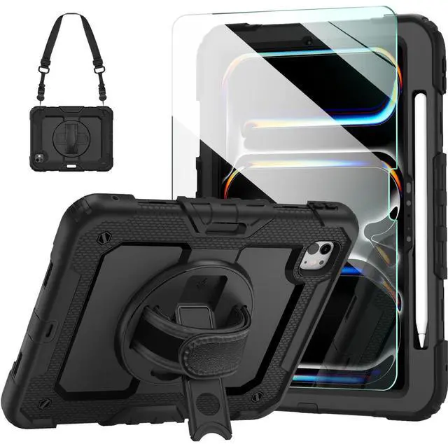 Ambison for iPad Pro 11 Inch Case 2024(M4, 5th Generation),with 9H Tempered Glass Screen Protector,Full-Body Heavy Duty Shockproof Protective Cover with 360deg Rotate Strap Stand,Pencil Holder-Black