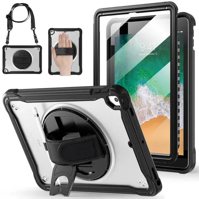 BRAECNstock Case for iPad 6th/5th Generation 9.7 inch 2018/2017, ipad Air 2nd Generation & Pro 9.7 inch Cover for Kids with Pencil Holder, Screen Protector, 360degRotating Hand Strap&Kickstand-Black