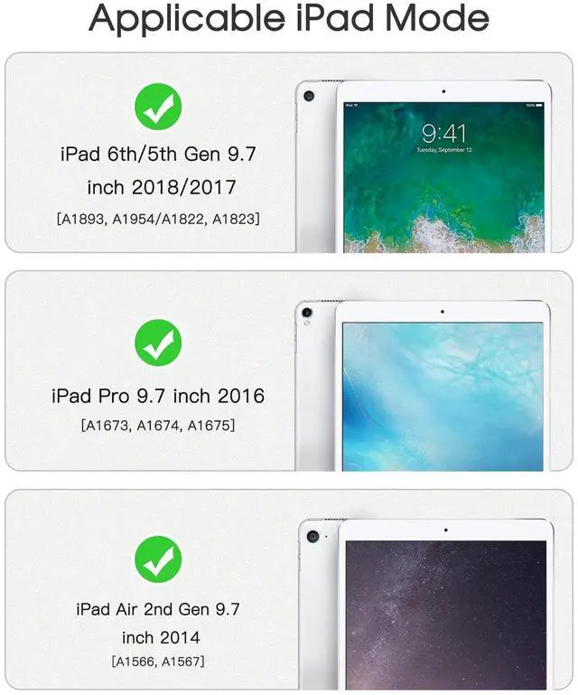 Compatibility: Specially design for Apple iPad 6th Generation 2018 (Model: A1893/A1954) & iPad 5th Generation 2017(Model:A1822/A1823) & iPad Air 2 2014(Model:A1566/A1567) & iPad Pro 9.7 inch 2016 (Model:A1673/A1674/A1675); NOT compatible with any other model device.WILL NOT FIT ANY OTHER MODEL! The Apple Pencil is not included