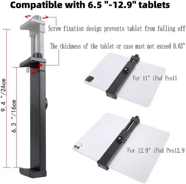 **Secure Tablet Attachment**: The ABS tablet clamp includes rubber padding on both ends and a reliable screw knob mechanism, ensuring your tablet remains securely in place without the risk of slipping or falling. It exceeds standard spring clamp specifications for robust holding power.