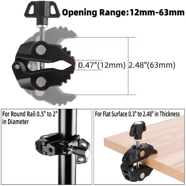 **Robust Super Clamp**: Made from strong aluminum alloy, the super clamp securely attaches to any round pillar between 0.5" to 2" in diameter. Enjoy versatility by connecting it to microphone stands, music stands, cymbal stands, or any vertical pole, perfect for performances, presentations, and gatherings.