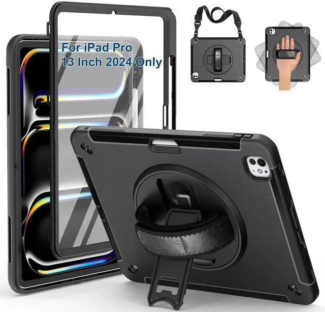 SUPFIVES Case for iPad Pro 13 Inch 2024 (7th Gen), Upgraded Military Shockproof TPU Protective Cover with Screen Protector/Shoulder Strap/Pencil Holder/Handle/Rotating Stand, Black