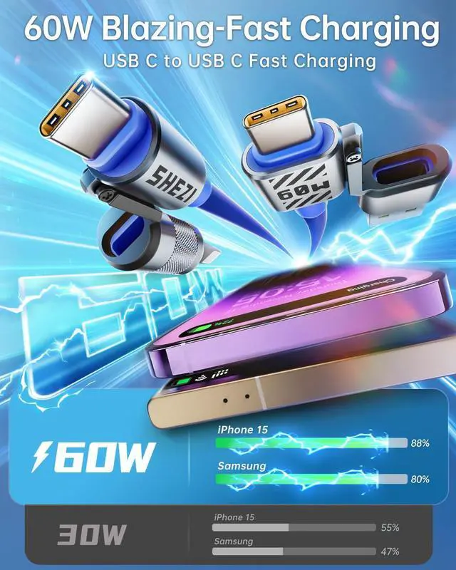 [60W Charges Your Devices Faster] Experience the next level of charging,speed 60W USB-C to USB-C cable can assuredly power all your p