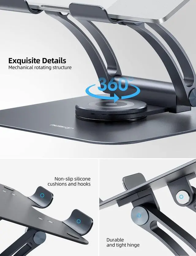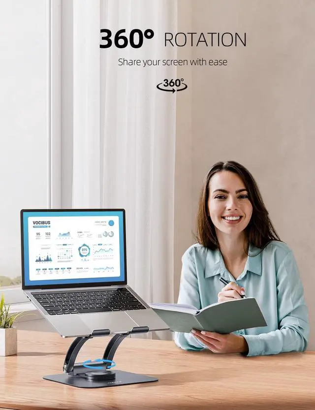 Rotation: This laptop stand lets you turn your laptop to any angle thanks to its 360 rotating axis that connects to the base. The rotating laptop stand for desk allows you to easily share your screen with someone sitting across the room or at another desk. It also works great for ideas sessions when collaborating with others over video chat or calls.