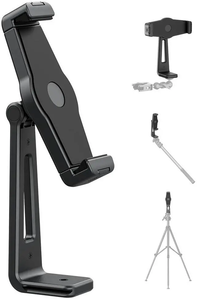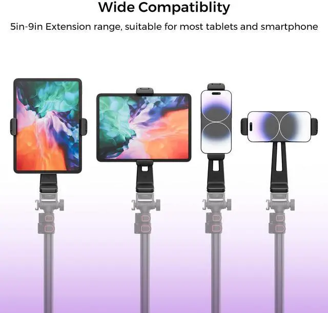 Sturdy & Stable: Made from upgraded ABS material, this iPad mount is built to withstand long-term use and harsh outdoor conditions, unlike typical plastic mounts. The rubber cushion on the tablet mounts claws protects your tablet from scratches and slips. Thanks to the upgraded base, this iPad holder for tripod can securely hold tablets weighing up to 2.2 pounds without wobbling, ensuring exceptional stability.