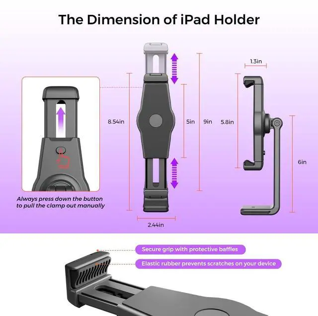 NOTE: To adjust the clamp size, simply press the button on the back of the claw and extend one side to fit your device. ^^ Professional Tablet Mount and