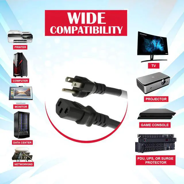 ^^ MULTI-DEVICE COMPATIBILITY: This NEMA 5-15P to IEC-60320-C13 AC power cord 3 prong supports 120V AC, providing reliable power for devices like PCs, monitors, printers, and projectors with the IEC C13 connector.