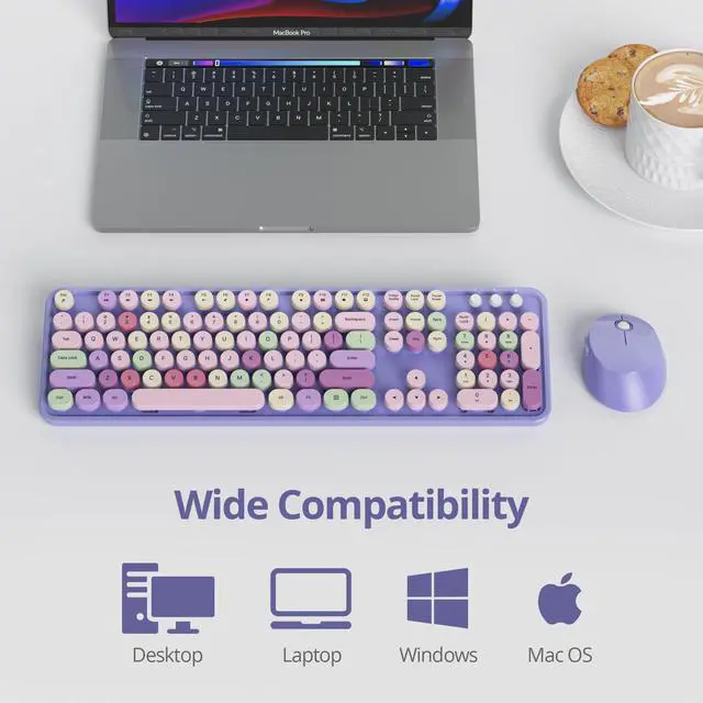 SbocKeeb Wireless Keyboard and Mouse Set, Retro Typewriter 2.4GH z Full Size 104-Key Cute Colorful Keyboard with Number Pad Round Keycaps for Windows PC Laptop (Colorful Purple)