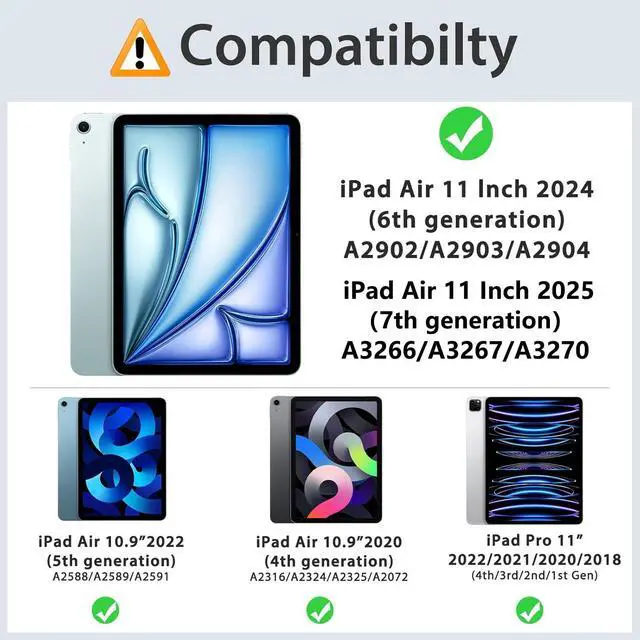 Compatibility: Designed for iPad Air 7th/6th Generation 11 Inch M3 M2 2025 2024 (A3266, A3267, A3270, A2902, A2903, A2904), iPad Air 5th/4th Generation 10.9" 2022 2020 (A2588, A2589, A2591,A2316, A2324, A2325, A2072), iPad Pro 11 4th Gen 2022 (A2435 A2761 A2762), 3rd Gen 2021 (A2301 A2377 A2459 A2460), 2nd Gen 2020 (A2228 A2231 A2068 A2230), 1st Gen 2018 (A1980 A2013 A1934 A1979). Not fits for iPad Pro 11 M4 2024 Model. Please check your model before purchasing