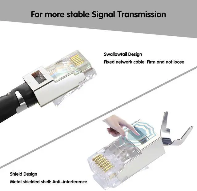 High Speed Data Transfer: The cat7/cat6a modular connector supports up to 10 Gigabit transmission speed. Metal-shielded shell and eliminate cross-talk and prevents electromagnetic interference (EMI), ensuring more stable connection.