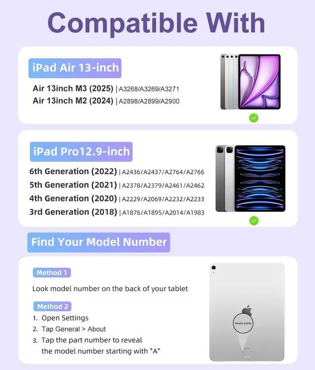 Compatibility: This keyboard case compatible with iPad Air 13 inch (M3) 2025 (Model: A3268, A3269, A3271), Air 13 inch (M2) 2024 (Model: A2898, A2899, A2900). Compatible with iPad Pro 12.9 inch 6th Generation 2022 (Model: A2436, A2437, A2764, A2766), 5th Generation 2021 (Model: A2378, A2379, A2461, A2462), 4th Generation 2020 (Model: A2229, A2069, A2232, A2233) and 3rd Generation 2018 (Model: A1876, A1895, A2014, A1983). Please check the model number starting with "A" on the back of your tablet before purchasing