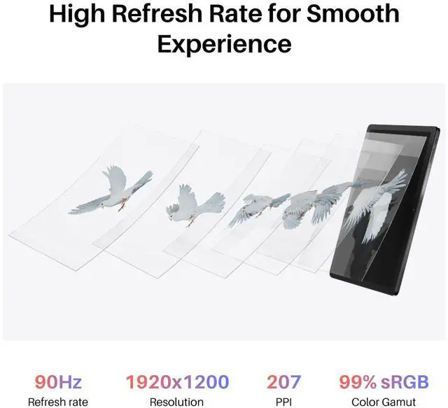 Vivid 90Hz FHD+ Display:90Hz refresh rate eliminates lag for smooth drawing, gaming, or video playback, delivering vivid visuals and immersive creative experiences. FHD+ (1920*1200) resolution ensures a high pixel density of 207 PPI, delivering a sharp visual experience. With an 99% sRGB color gamut, every stroke of your artwork is precisely represented.