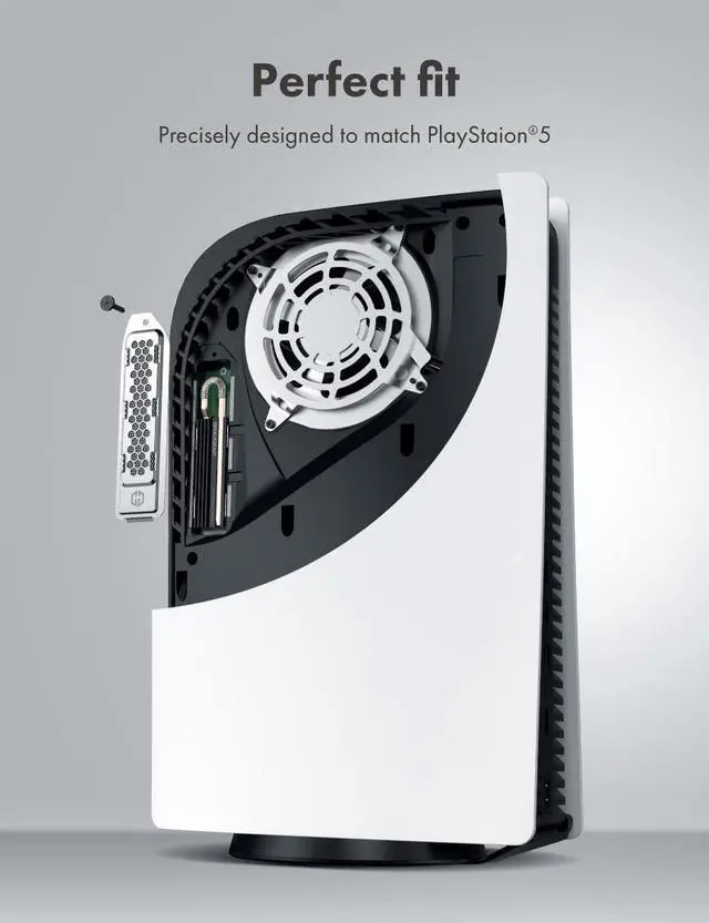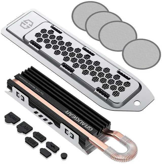 Custom-designed for PlayStation 5GRAUGEAR PS5 cooling and dust-proof set is specially designed for PlayStation 5 and helps to prevent the dust from entering the game console and cooling your console at the same time. ^^ PS5 SSD Heatsink Cover SetM. 2 SSD dust cover with the extruded aluminum heatsink is designed to fit PlayStation 5 and improve the thermal performance of the SSD mounted in the expanded storage slot. The metal cover perfectly fits into the expansion slots of the PS5 and features with the dust filter, copper heat pipe and plate-fin design of aluminum alloy.