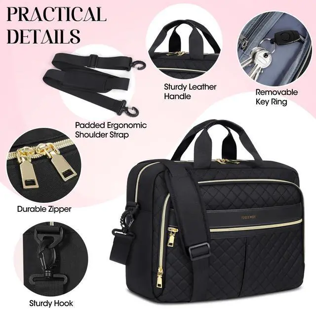 Large Capacity & Multiple Compartments: Laptop bag has a large capacity with four compartments for almost all your daily needs. One main compartment features padded pockets for 15.6" laptop and 12.9" iPad, two mesh pockets for power cord and mouse, and two elastic mesh pockets for water bottle or umbrella; One front organizer compartment with key ring, two pen slots, one mesh zipper pocket & three open slots; Two front zipper compartments for magazines, textbooks, kindle, passport, wallet, etc.