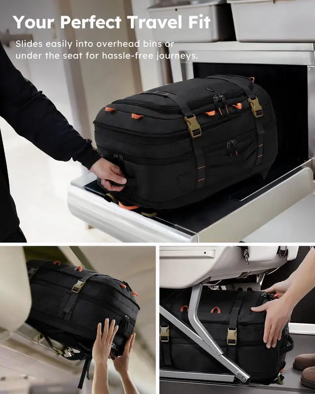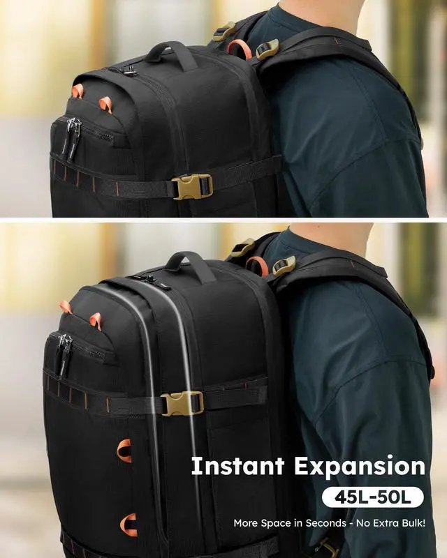 [(TSA-Approved & Airline Friendly)] Skip the hassle at security checks! The TSA-compliant 90-180deg lay-flat design of carry on luggage backpack lets you breeze through airport screening. Compact yet spacious (21.65"x12.99"x11.22"), it fits overhead bins, helping you avoid extra baggage fees. The personal item travel backpack is expandable from 45L to 50L, perfect for 3-5 day trips without bulky luggage.