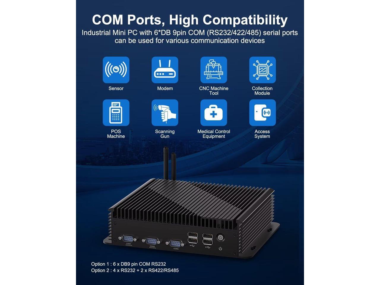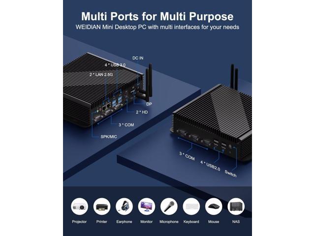- [(Wide Voltage & 7x24 Stable Operation)] This fan-equipped Mini Desktop PC supports wide-voltage DC 9V~36V input, ensuring continuous power supply during voltage fluctuations or in harsh power environments. Ideal for automated production lines, industrial control systems, and areas with unstable power. With its small size (8.86x6.89x2.17inch, 3.75 lbs) and low-power design, it's suitable for kiosks, digital signage, POS, and supermarket cashier systems.