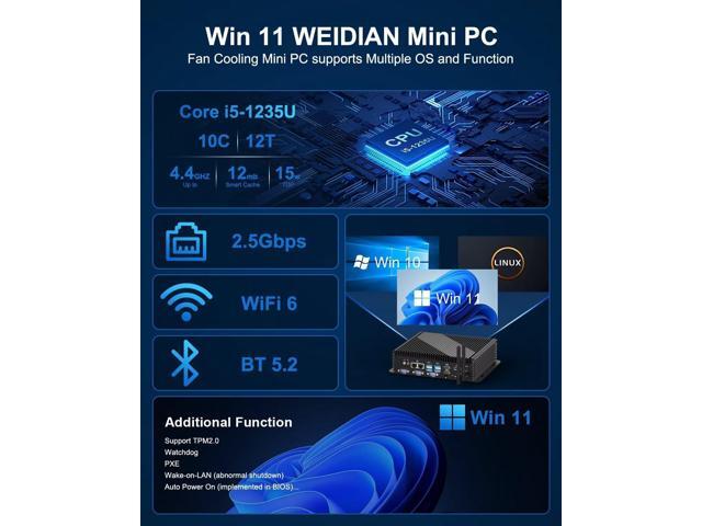 - [(Powerful Mini PC i5-1235U)] The 2025 New WEIDIAN Mini PC FH4 is powered by the Core i5 - 1235U processor with integrated Iris Xe Graphics, 15W TDP. Pre-installed with Win 11 Pro (supports Win 10/Linux). Industrial Mini PC's all-aluminum alloy chassis and hidden cooling fan design ensure efficient heat dissipation (<=50dB at full load). This setup enables the PC to operate stably, effectively keeps dust out, and is well - adapted to industrial applications.