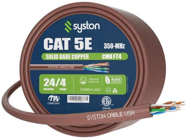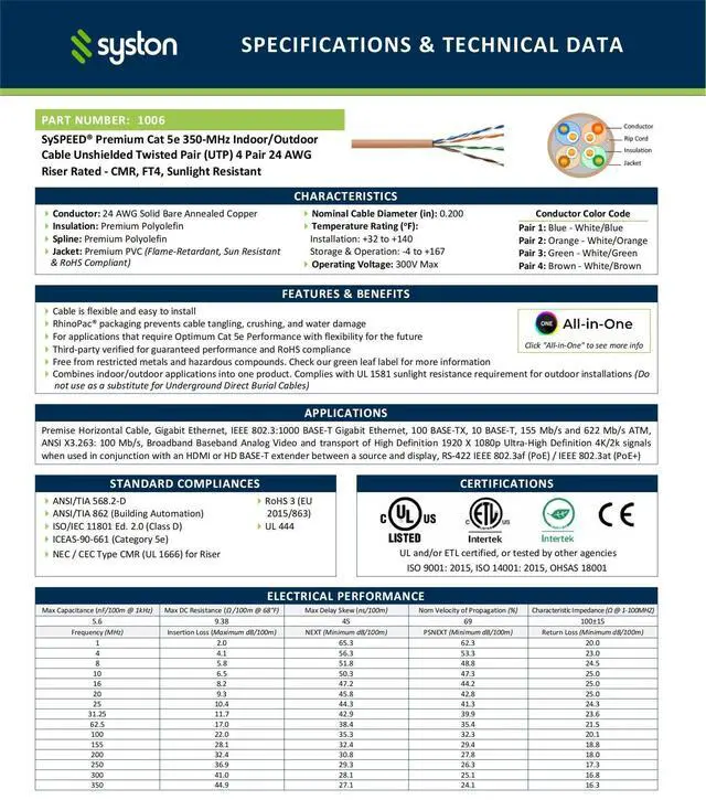 350 MHz Speed High-Data transfer for networking peripherals and applications that utilize RJ45 connectors including routers, switches, online gaming, video surveillance and streaming, IP Cameras, POE Power over Ethernet, HDMI or HD Base-T extenders, Computers, Laptops, PlayStation, Xbox, and any connection with an RJ45 connector looking to connect to the internet. ^^ The Premium SySPEED Series Cat 5e 350MHz Riser Indoor/Outdoor Sunlight resistant and In-wall CMR rated cable offers true digital performance while meeting the high standards in fire resistance. Cat 5e 350MHz Riser CMR rated Bulk High-Performance cable.