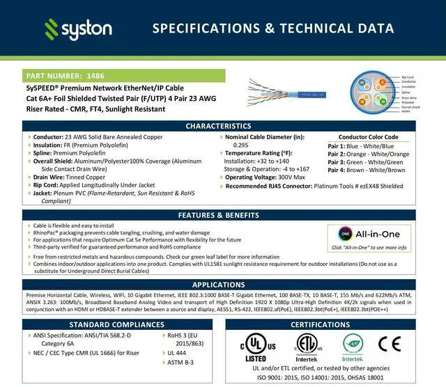 Overall Shield: The aluminum foil shielding layer can reduce EMI and RFI, provides stable transmission and offers high specification fidelity for long distance transmission.