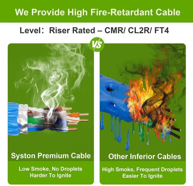 ^^ CMR (Riser-Rated): Our cable is designed with your safety in mind. It features a CMR/CL2R/FT4/FPLR (Riser-Rated) flame-retardant rating that provides peace of mind in case of fire. This type of cable is commonly used in commercial projects where enhanced fire safety requirements are needed, exceeding the basic fire safety rating of CM cables.