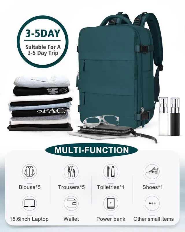 Large Capacity For Easy Carry :This backpack has a lot of compartments. The main compartment can hold 4 tops and 4 pairs of pants.Side pockets can hold water glasses or umbrellas. There is a front pocket for cell phones, wallets and other small items, and an anti-theft back pocket for cash, cards and more. Large capacity design, can put 1-2 people's clothes, suitable for 3-5 days of travel, so that you travel more light.Our mission is to make your travel easier