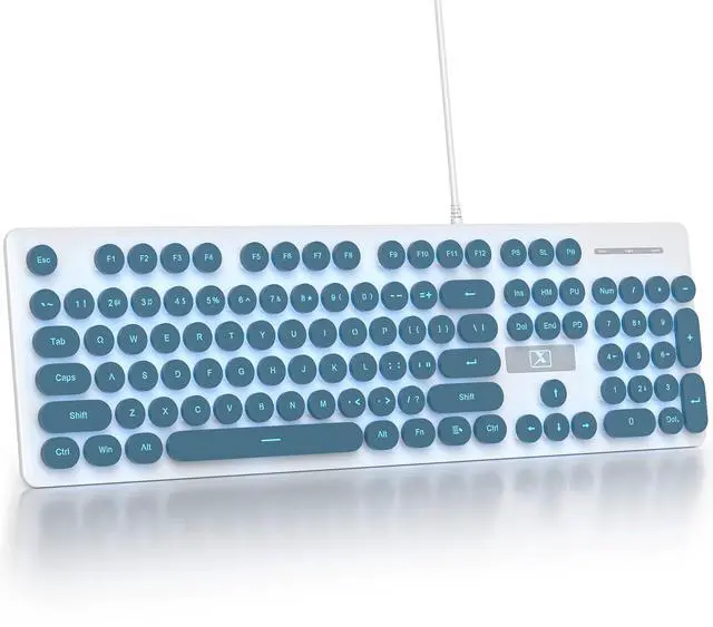 Fogruaden Wired Retro Typewriter Keyboard, Quiet Full Size Membrane Keyboard Light Up, Blue Cute Computer Keyboards, 104 Round Keys, Blue LED Backlit, Slim, Silent for Windows PC, Laptop