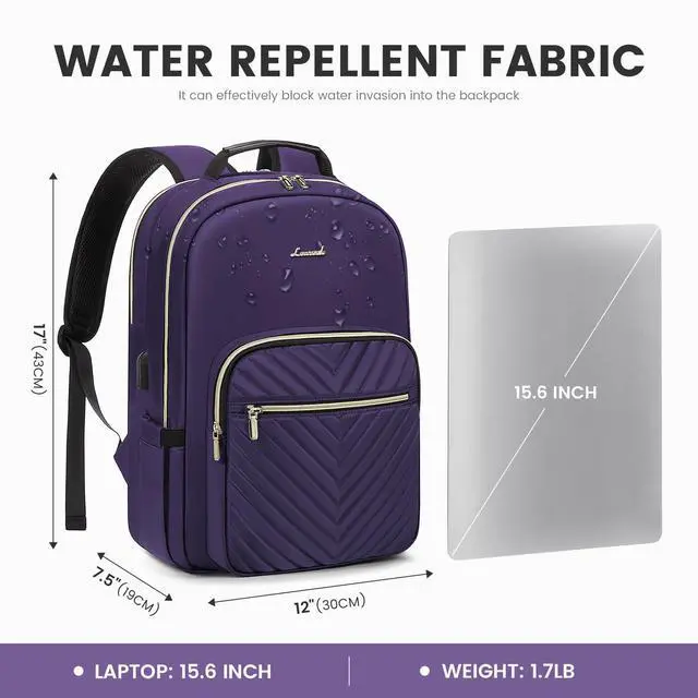[(Upgraded Laptop Backpack Women)] : Classic V-shaped embroidery thread. Upgraded double LOVEVOOK no-slip metal zippers,water resistant Nylon fabric with polyester lining, ensures long lasting usage. Total of 4 compartments and 16 pockets for your computer,A4 folder,bottles,umbrellas,clothes,work supplies,college supplies and travel essentials.Dimensions: 12"L 17"H 7.5"D, Weight: 1.7lbs.