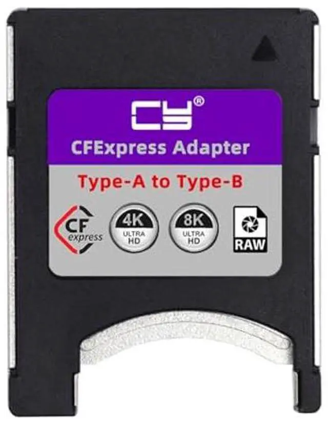A CFexpress type A memory card can be fitted into the CFexpress adapter, which can be used in a CFexpress type B slot of a device. Thus, the adapter converts the CFexpress type A memory card into type B.