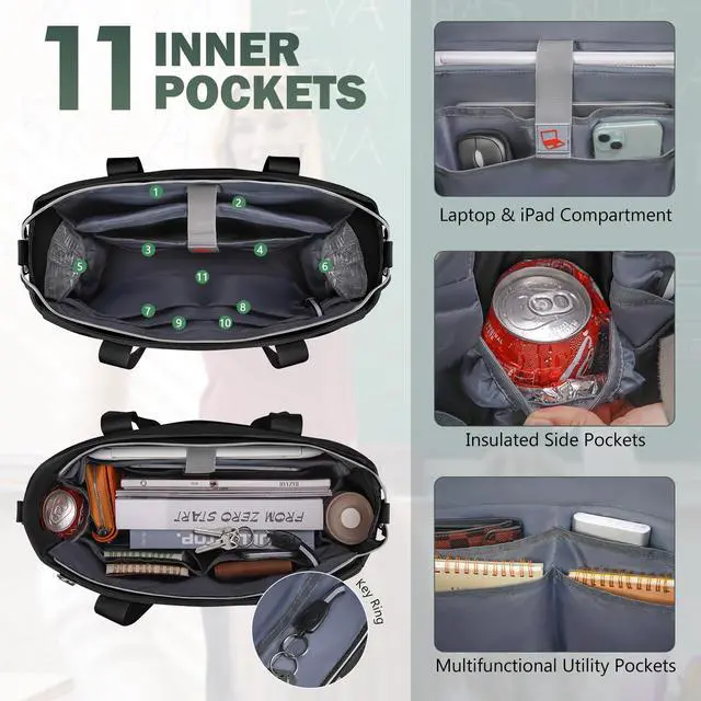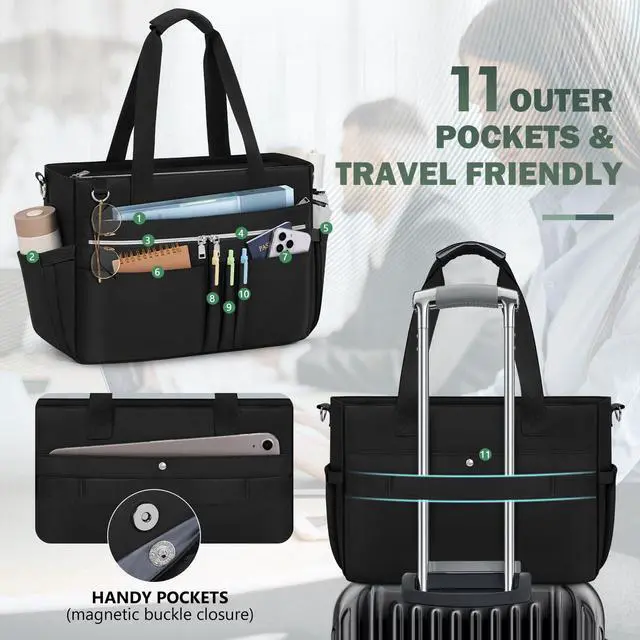 22 Pockets for Maximum Organization:11 internal pockets: 1 spacious main compartment, 1 padded laptop(15.6") compartment, 1 iPad pocket, 2 insulated pocket, 6 slip pocket.11 external pocket for quick access: 1 large zipper pocket, 2 small zipper pocket, 2 open pocket, 3 pen slot, 2 elastic side pockets, and 1 back magnetic pocket. The multi-pocket design of the teacher bag allow all your teaching materials, medical supplies, work materials, college supplies, and daily necessities to be organized