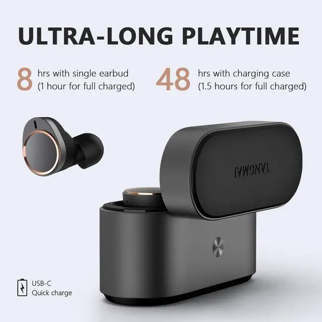 The USB-C Quick charge involved in charging case, enables you to get up to 2 hours of listening with just 10 minutes charging. ^^ [Lightweight Practicality Design ]- Aluminum alloy case combine practicality with elegance, while ensuring durability, portability, and the metal texture, also keeping the Bluetooth headphones' artistic. ^^ [ One-step Pairing and Touch Control ]- Super easy to use, when you take the wireless earbuds from the charging case, theyll automatically connect to the last paired device. Installed with high-sensitivity touch sensors let you answer calls, adjust the track, or pause music with just the touch of a panel.