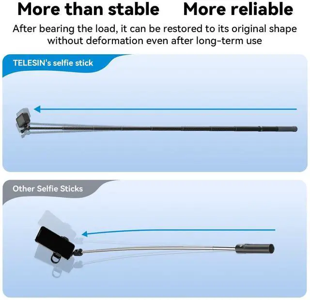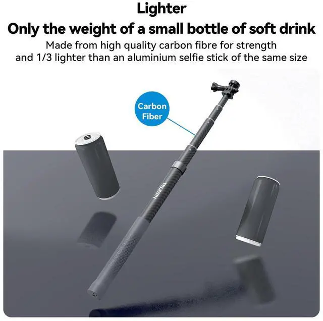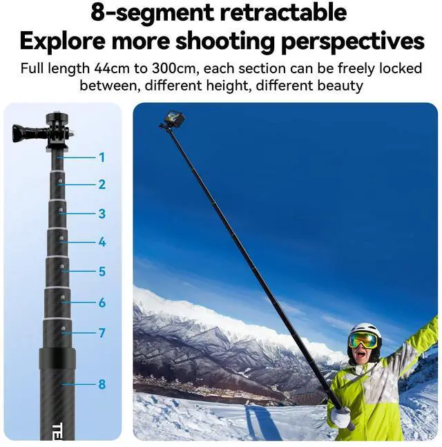 Extendable at Any Length, No StuckWith the upgraded telescoping technique, this TELESIN G3 118"/3M selfie pole can be extendable at any length as you want between 44cm/ 17.32 inch to 300cm/118inch. (read the clockwise and counterclockwise remark to lock and unlock the pole). ^^ Lightweight And Compact Net weight only 13oz/374g, portable, extendable and compact enough to carry in a purse, backpack, or slip in your back pocket. The best ideal action camera selfie pole for surfing, diving, snowboarding, skiing, skateboarding, traveling, live events and much more.